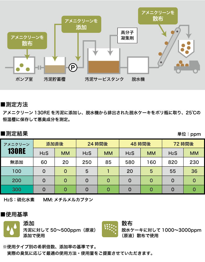 排水処理用途における「アメニクリーン」は、原因物質を化学反応させることで無臭物質に変化させ、悪臭を発生させないようにします。新たに排水処理施設以外でも使用可能な特殊型も取り揃えました。